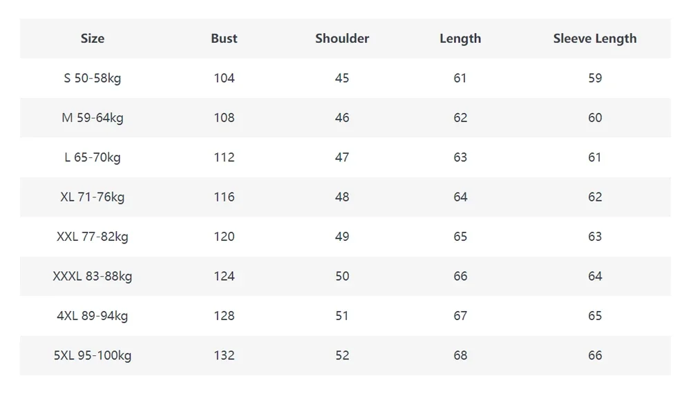 3.All measurements above are actual garment measurements. For a good fit,please add 8cm~10cm to your body chest measurement when selecting your size from the table above.
