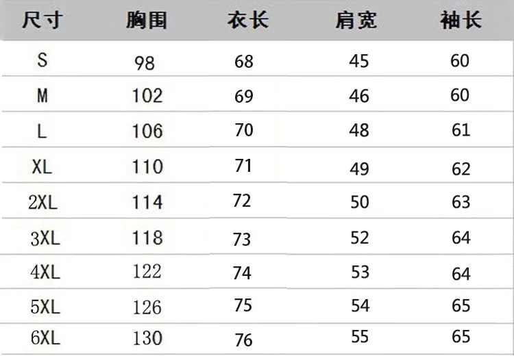 size_info: {"sizeInfoList":[{"length":{"cm":"98","inch":"38.58"},"size":"S","vid":-1},{"length":{"cm":"102","inch":"40.16"},"size":"M","vid":-2},{"length":{"cm":"106","inch":"41.73"},"size":"L","vid":-3},{"length":{"cm":"110","inch":"43.31"},"size":"XL","vid":-4},{"length":{"cm":"114","inch":"44.88"},"size":"XXL","vid":-5},{"length":{"cm":"118","inch":"46.46"},"size":"XXXL","vid":-6},{"length":{"cm":"122","inch":"48.03"},"size":"4XL","vid":-7},{"length":{"cm":"126","inch":"49.61"},"size":"5XL","vid":-8},{"length":{"cm":"130","inch":"51.18"},"size":"6XL","vid":-9}]}