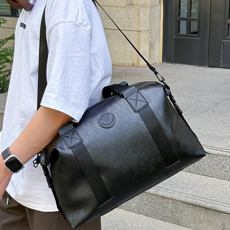 Crafted from rugged black faux leather, this duffle bag offers a sleek look and durable construction for travel and gym use.