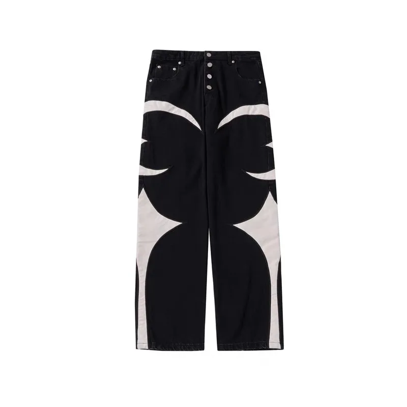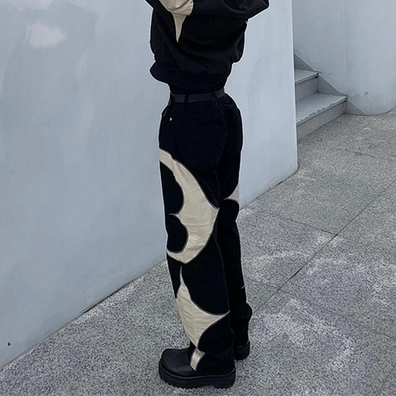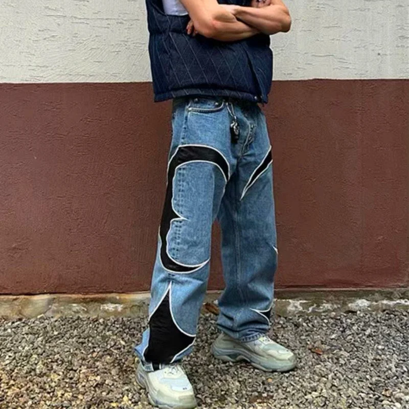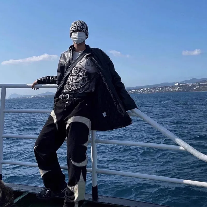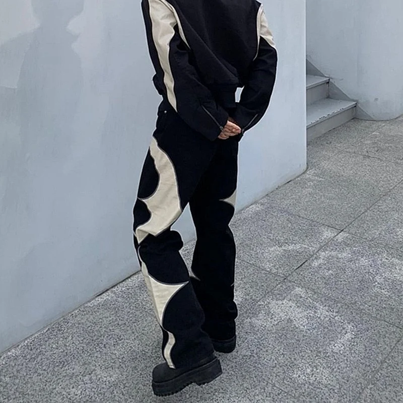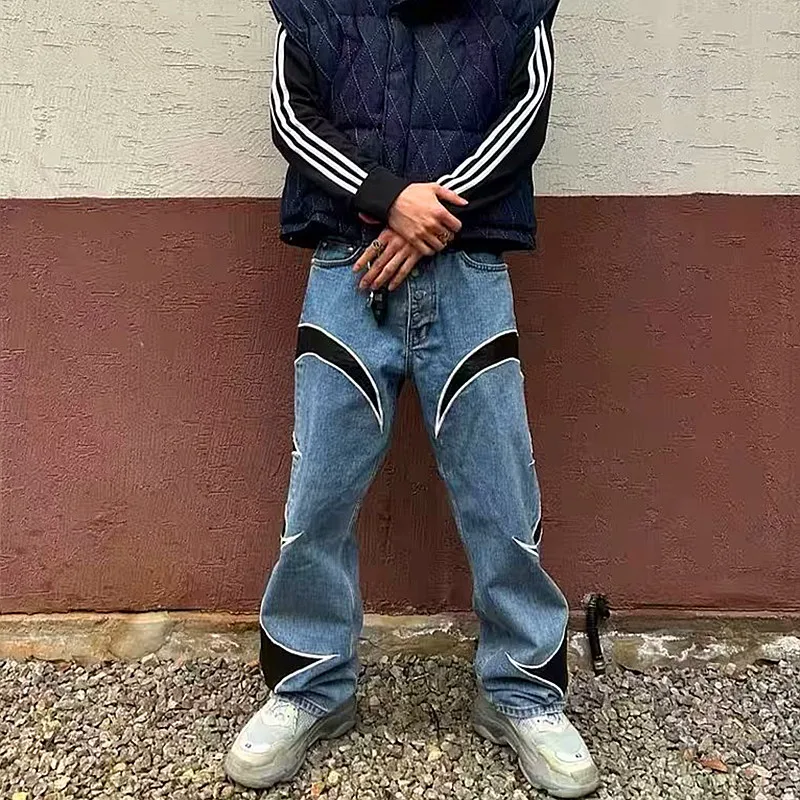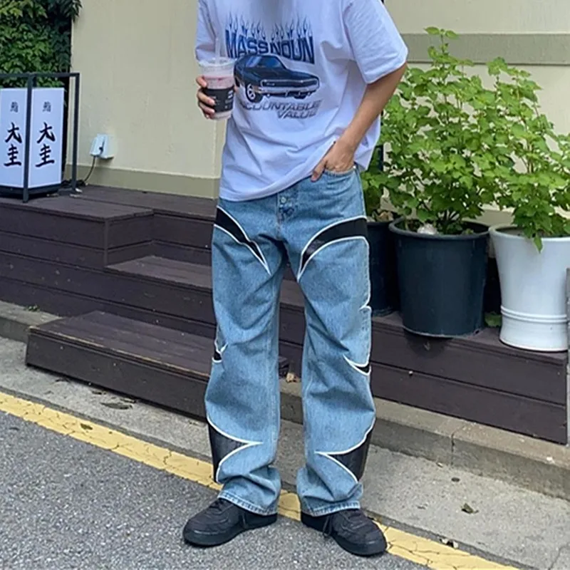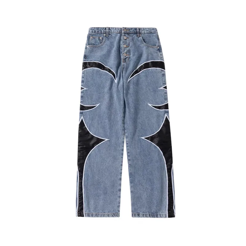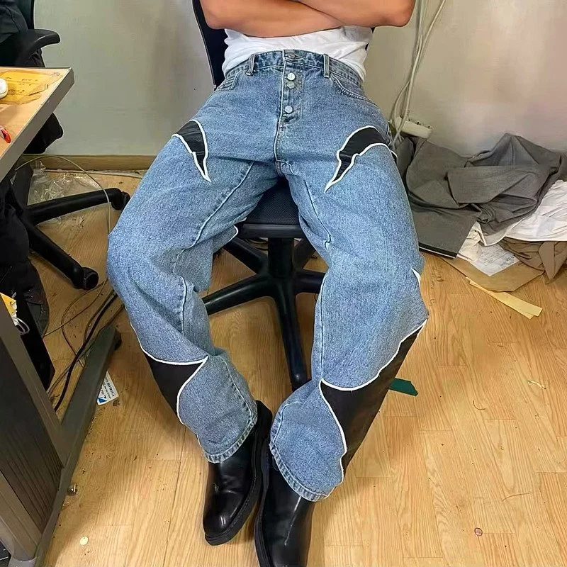 2023 Kanye Y2K Denim & Pu Leather Embroidery Baggy Stacked Jeans \