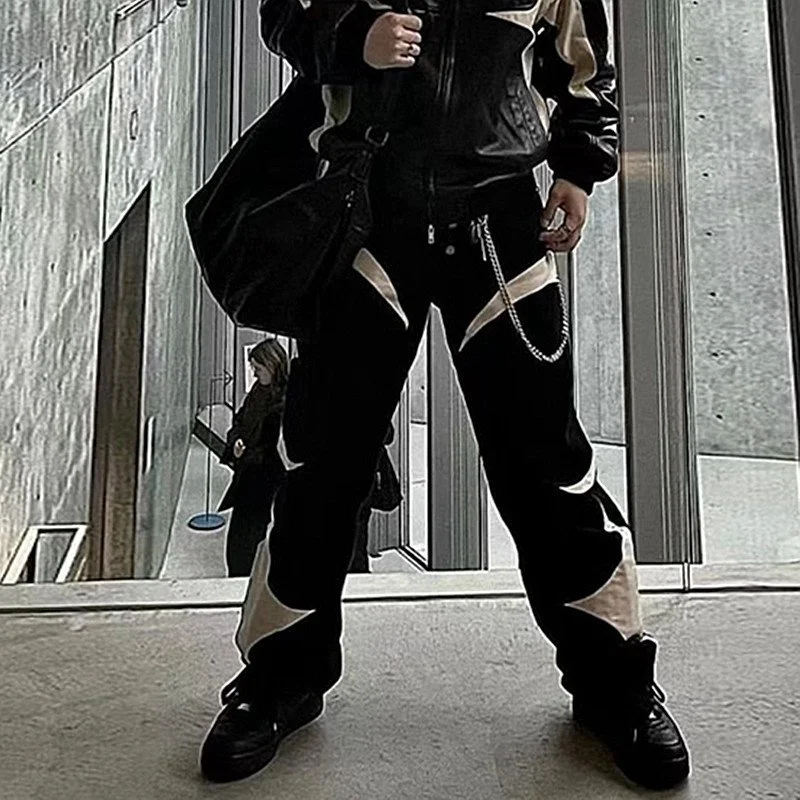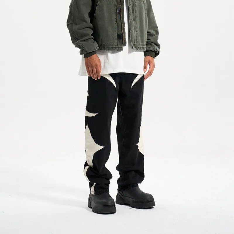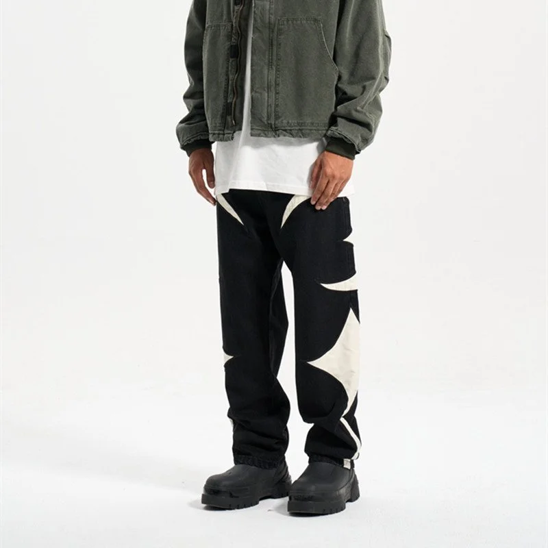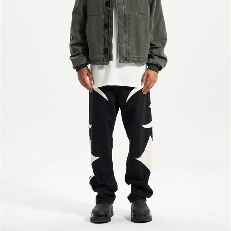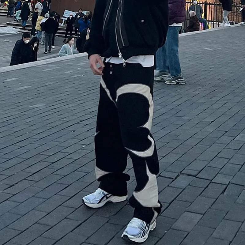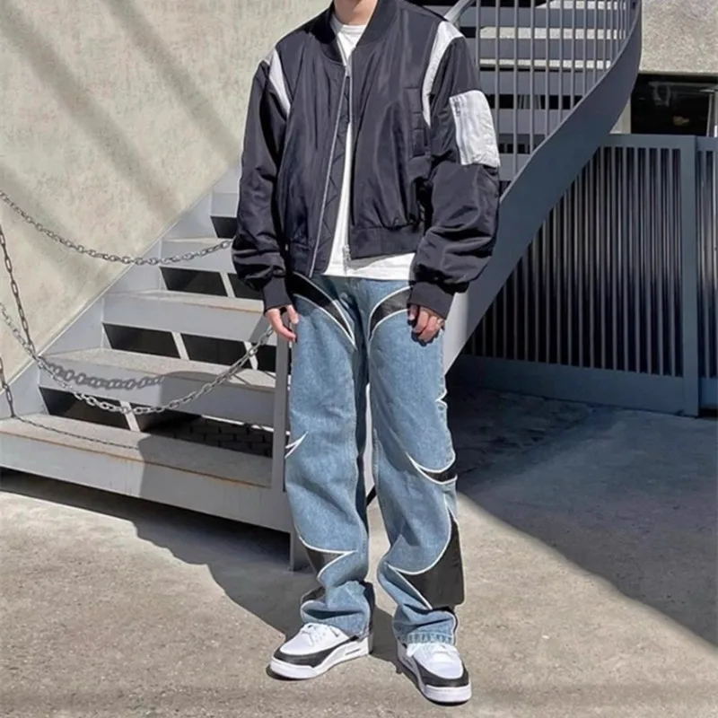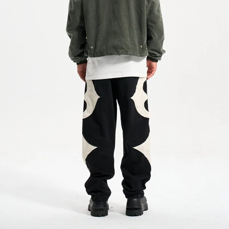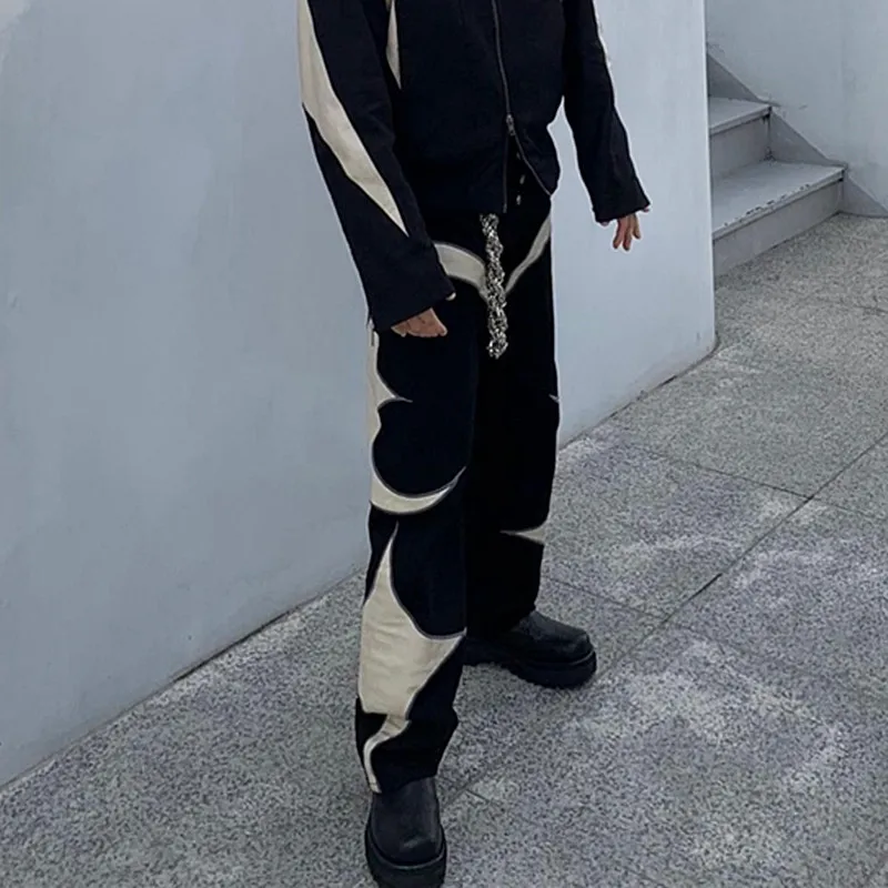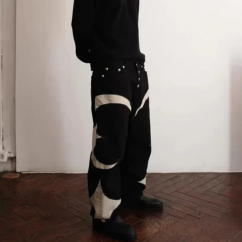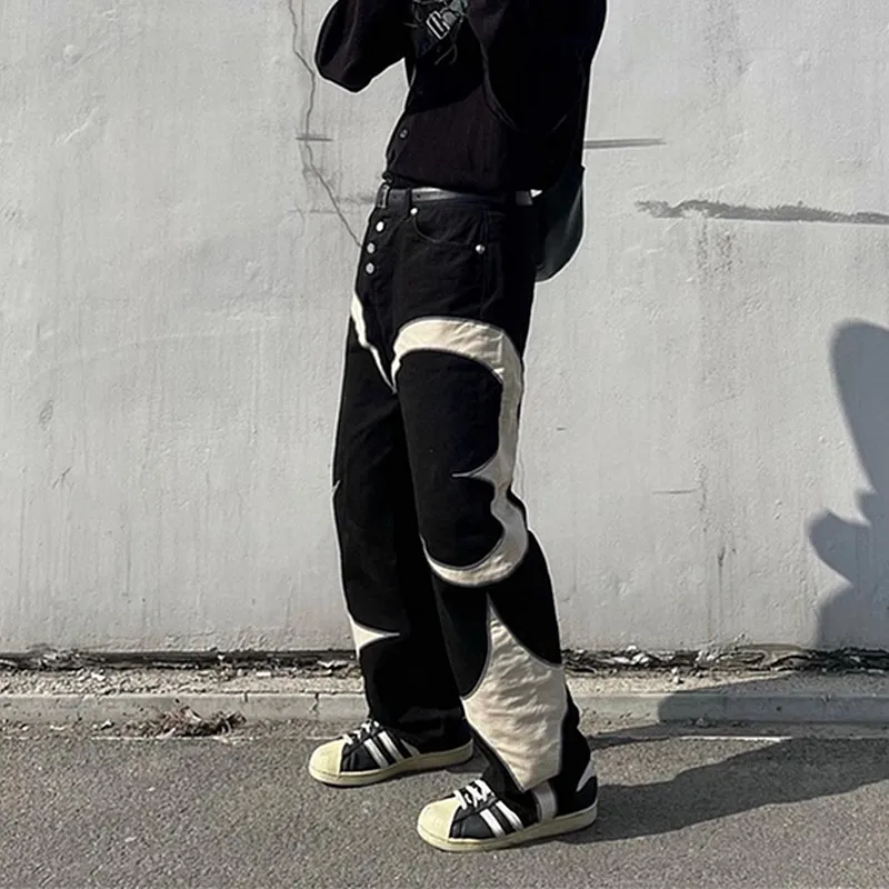 2023 Kanye Y2K Denim & Pu Leather Embroidery Baggy Stacked Jeans \