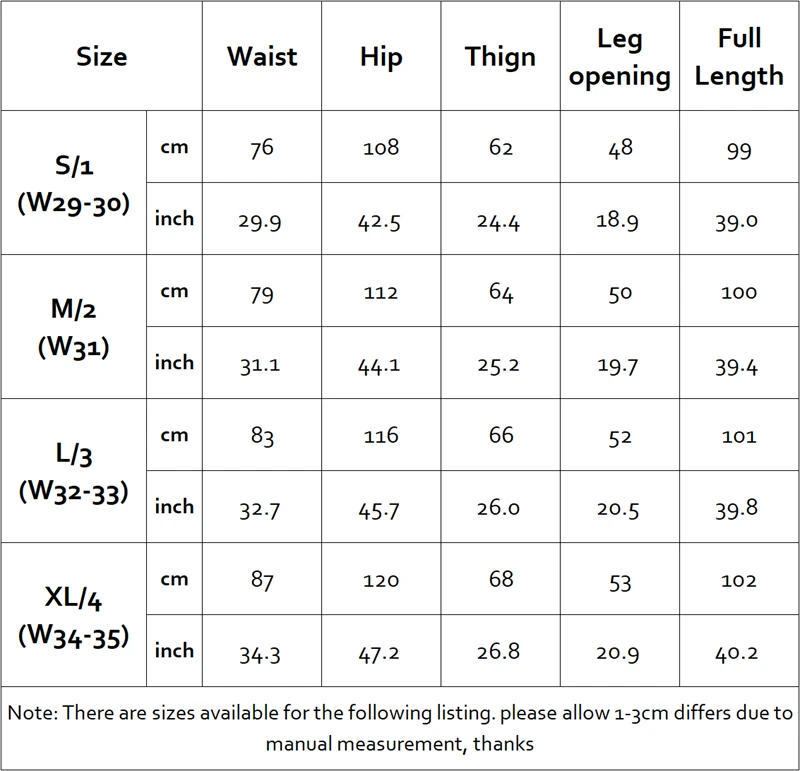 - S = label size 1 (W29-30), M = label size 2 (W31), L = label size 3 (W32-33), XL = label size 4 (W34-35)
