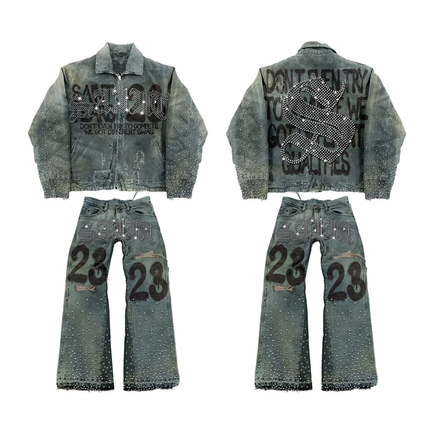 Mens Clothes Letter Embroidery Patchwork Rhinestone Y2k Two Piece Set Hip Hop Retro Zipper Denim Jacket Baggy Jeans Streetwear