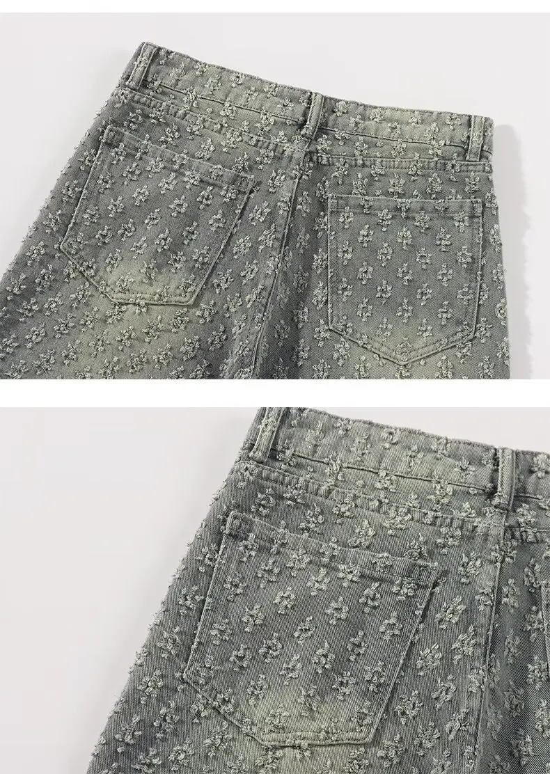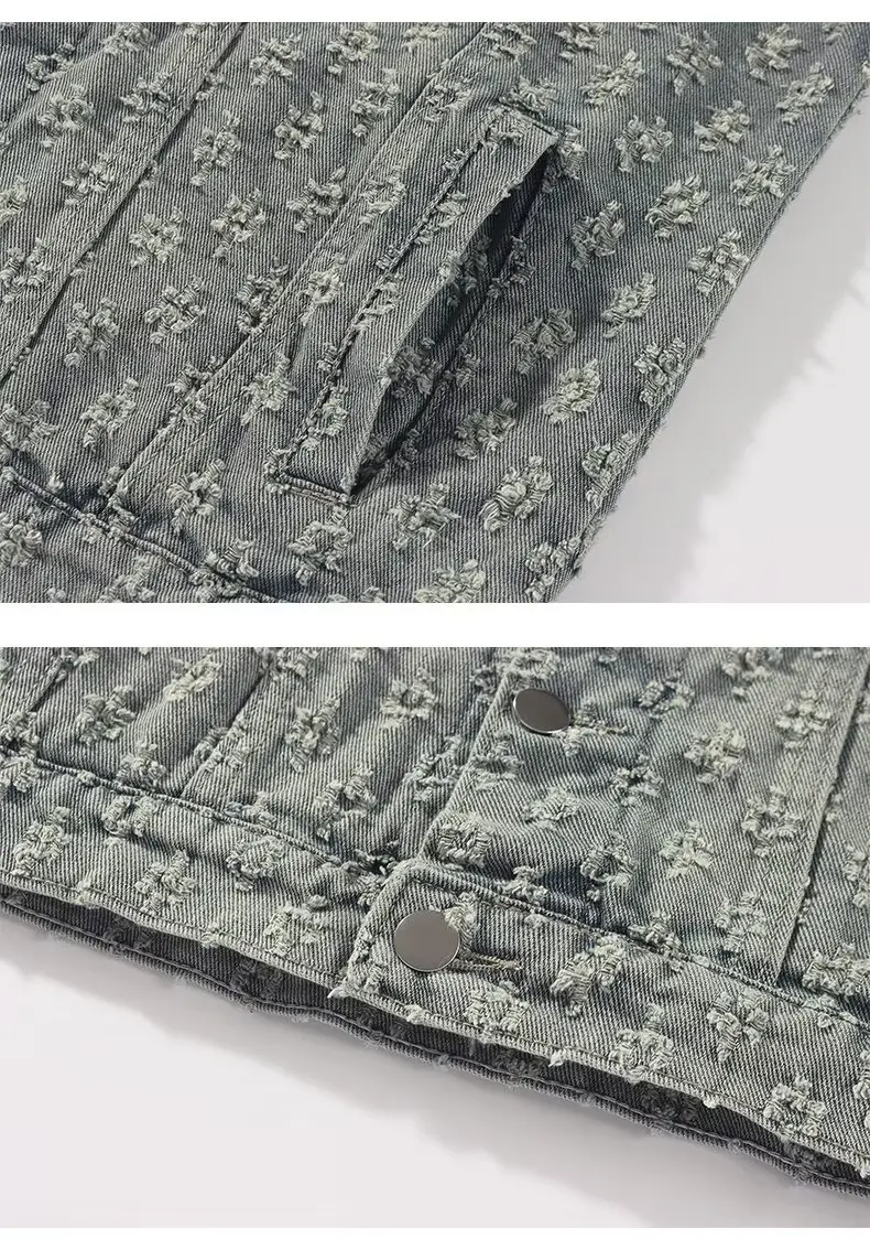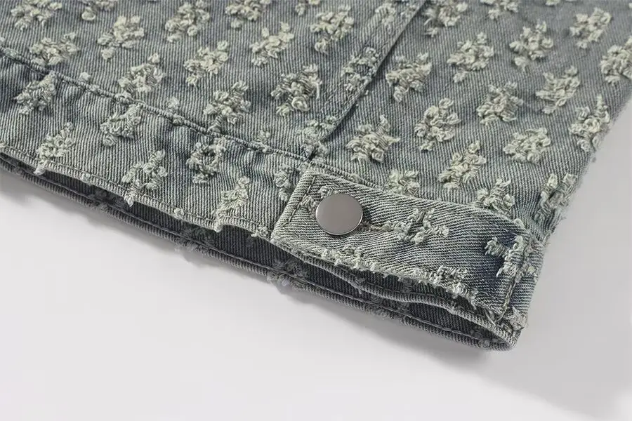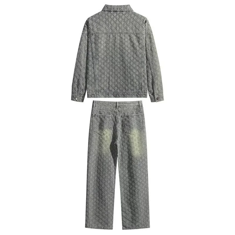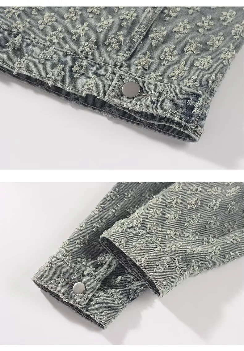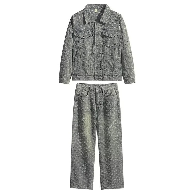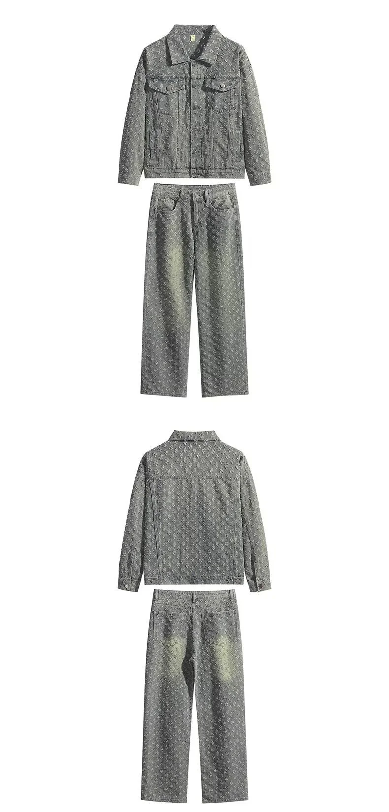 Men's Fashionable Hooked Floral Denim Set Pure Color Worn-In Look
