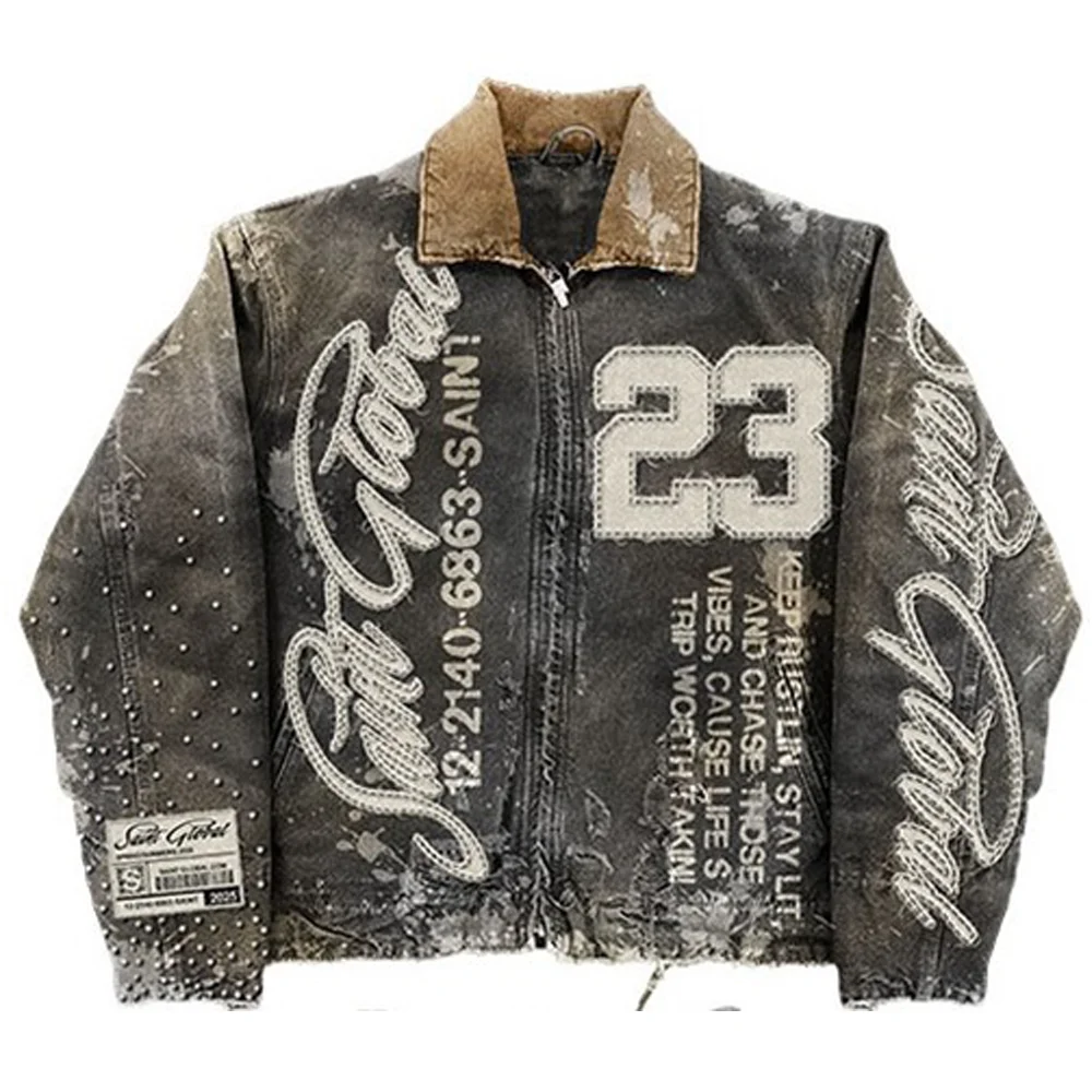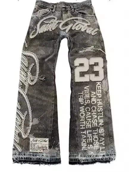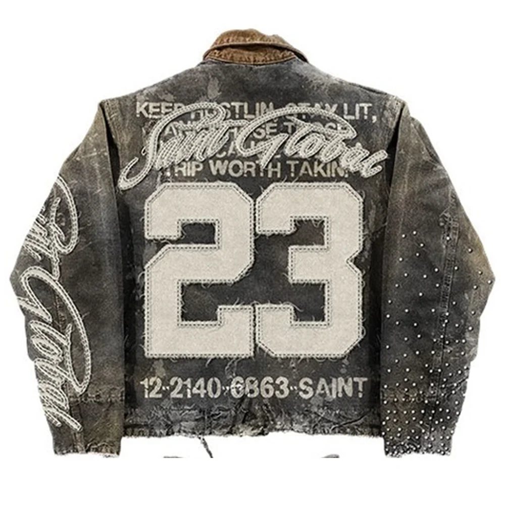 Streetwear American Washed Vintage Jeans Denim Jacket Two Piece Y2K Sportswear Men Hip Hop Letter Patchwork Baggy Trousers Coats