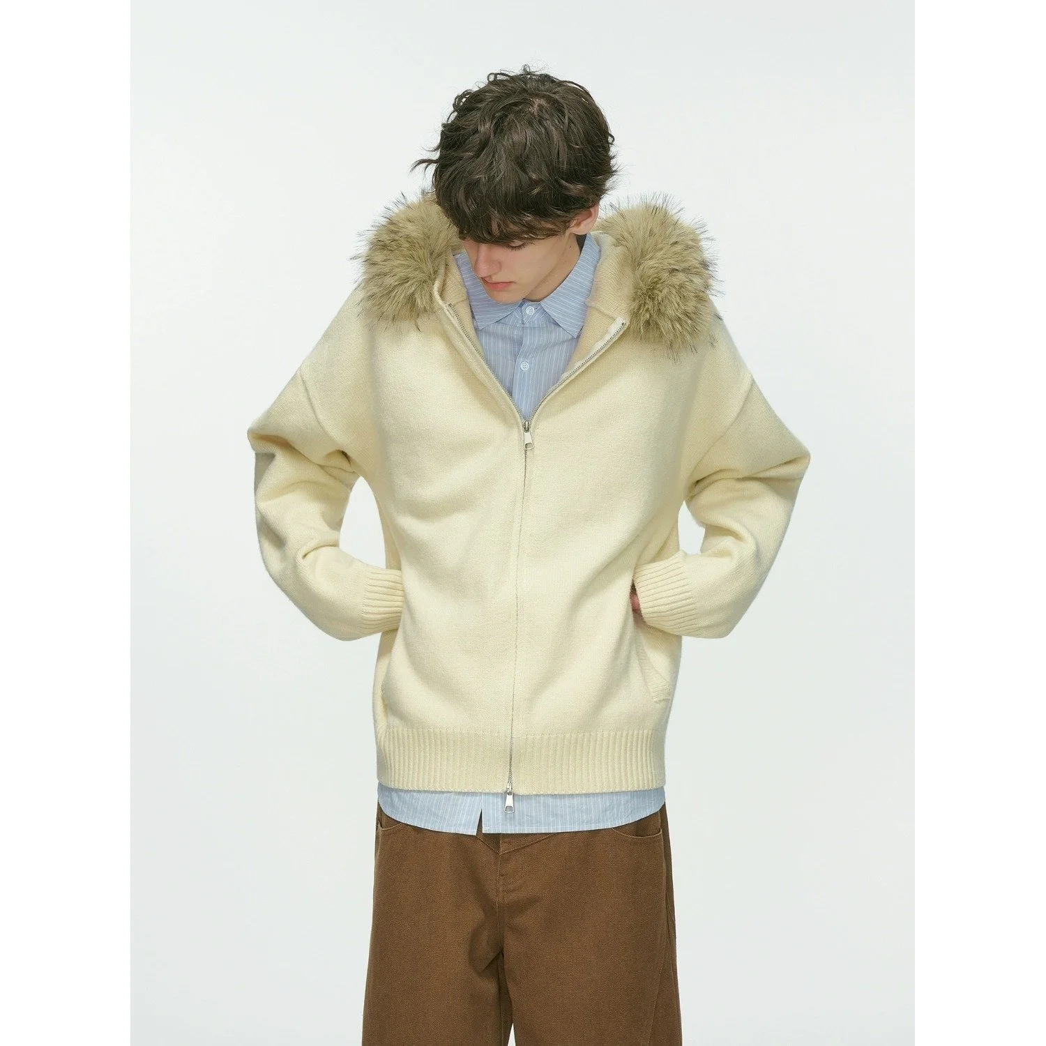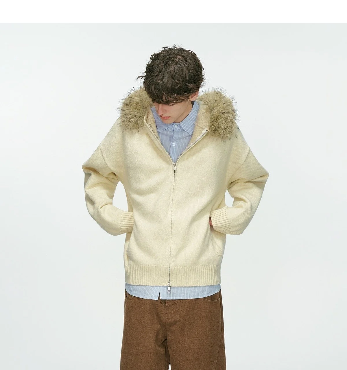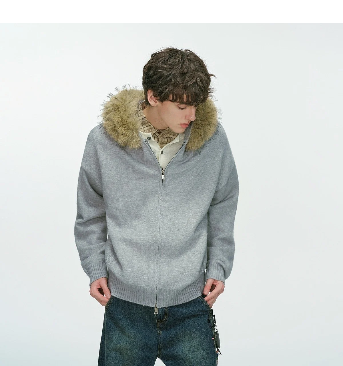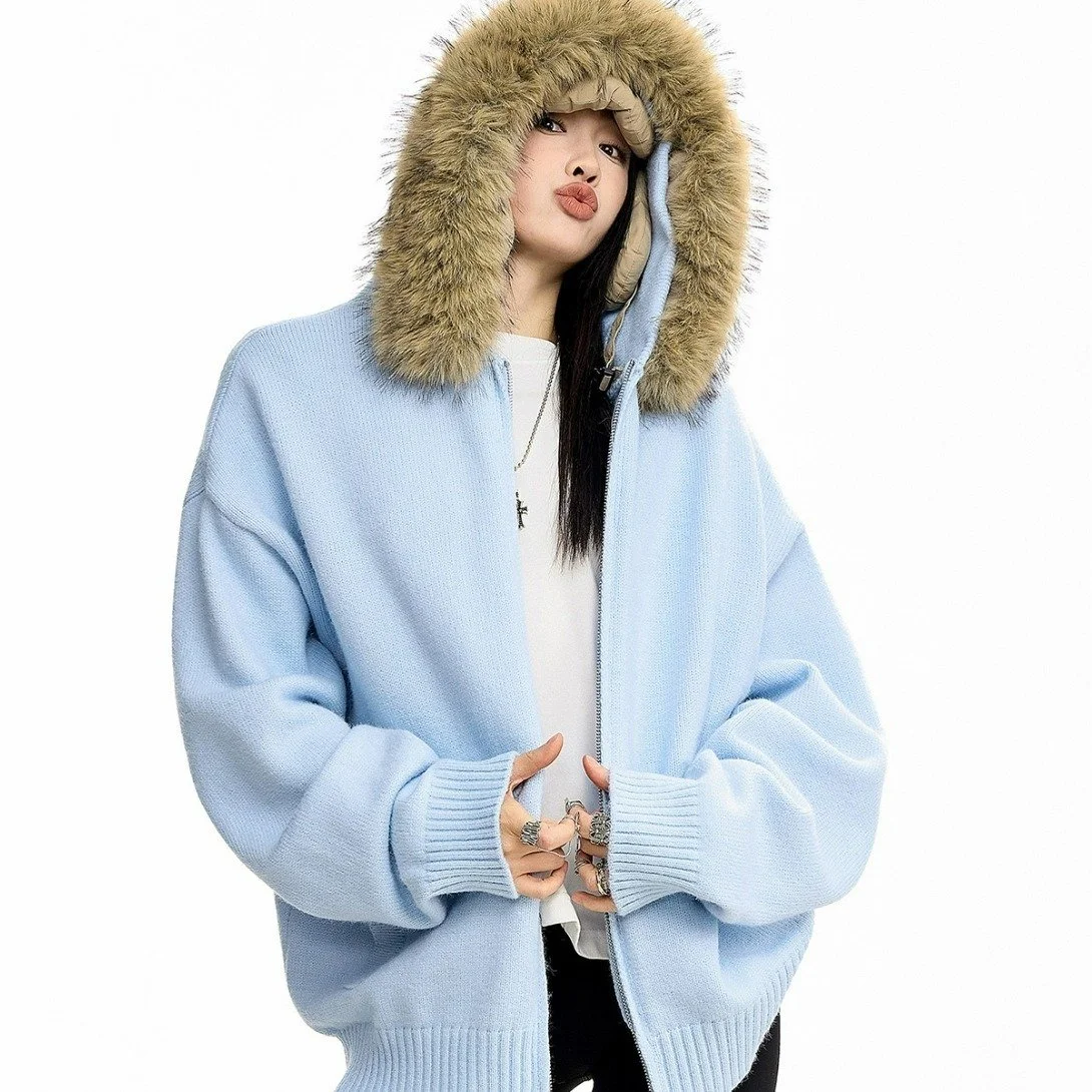 New Men's Winter Thickened Warm Detachable Fur Collar Knitted Open Cardigan