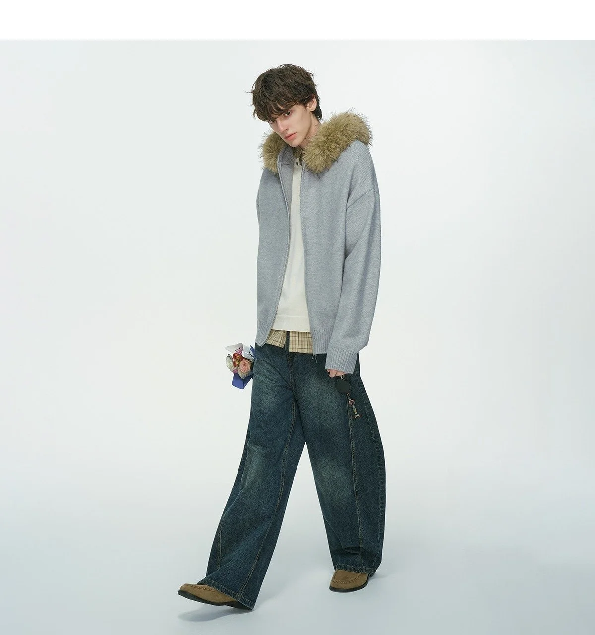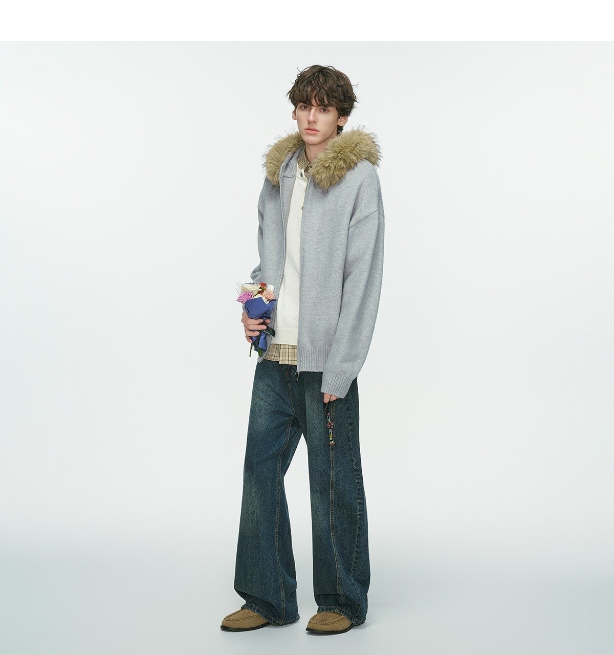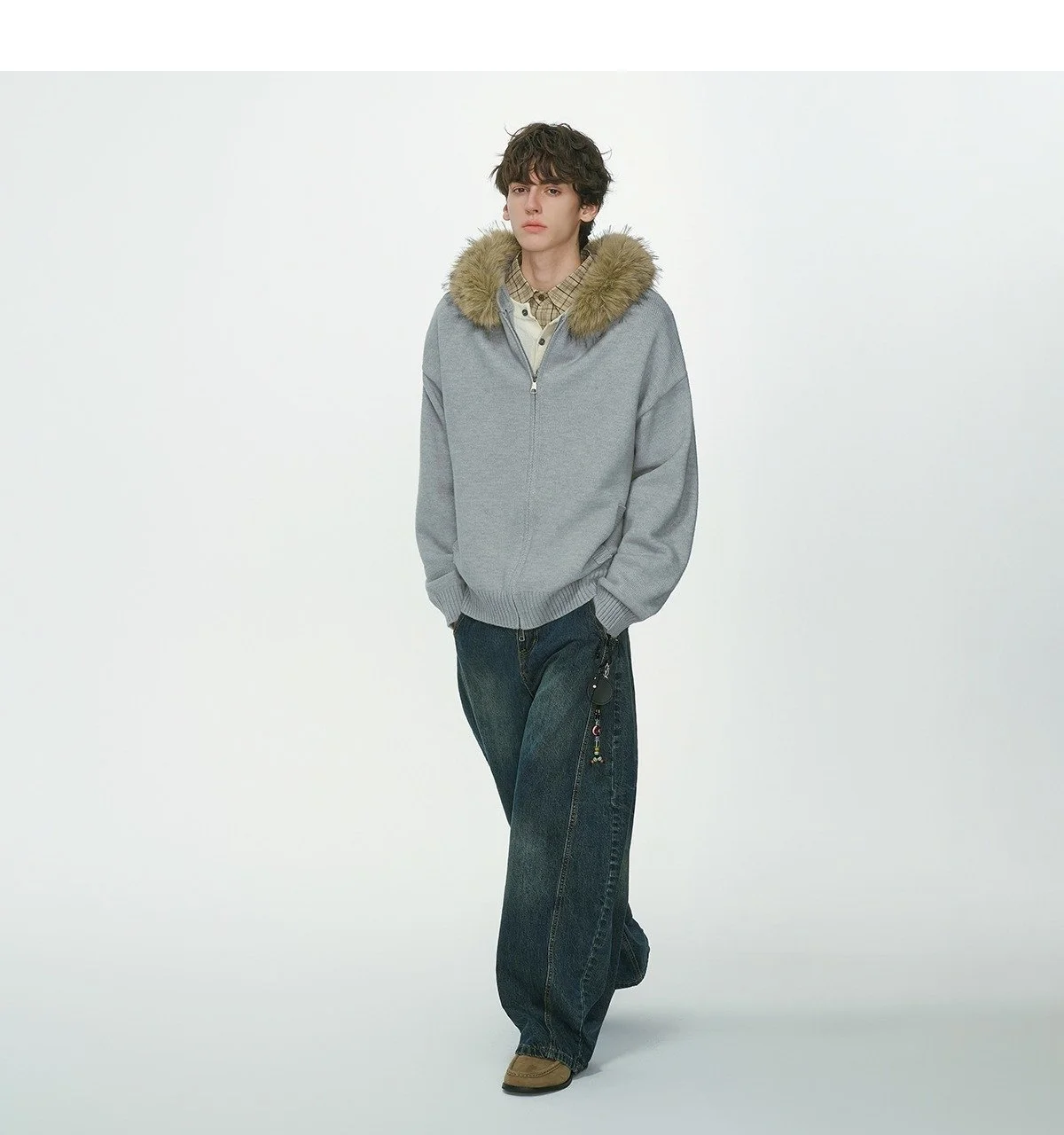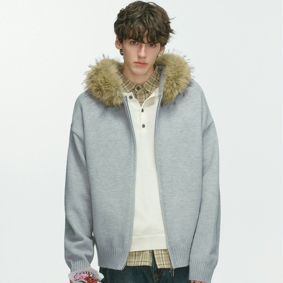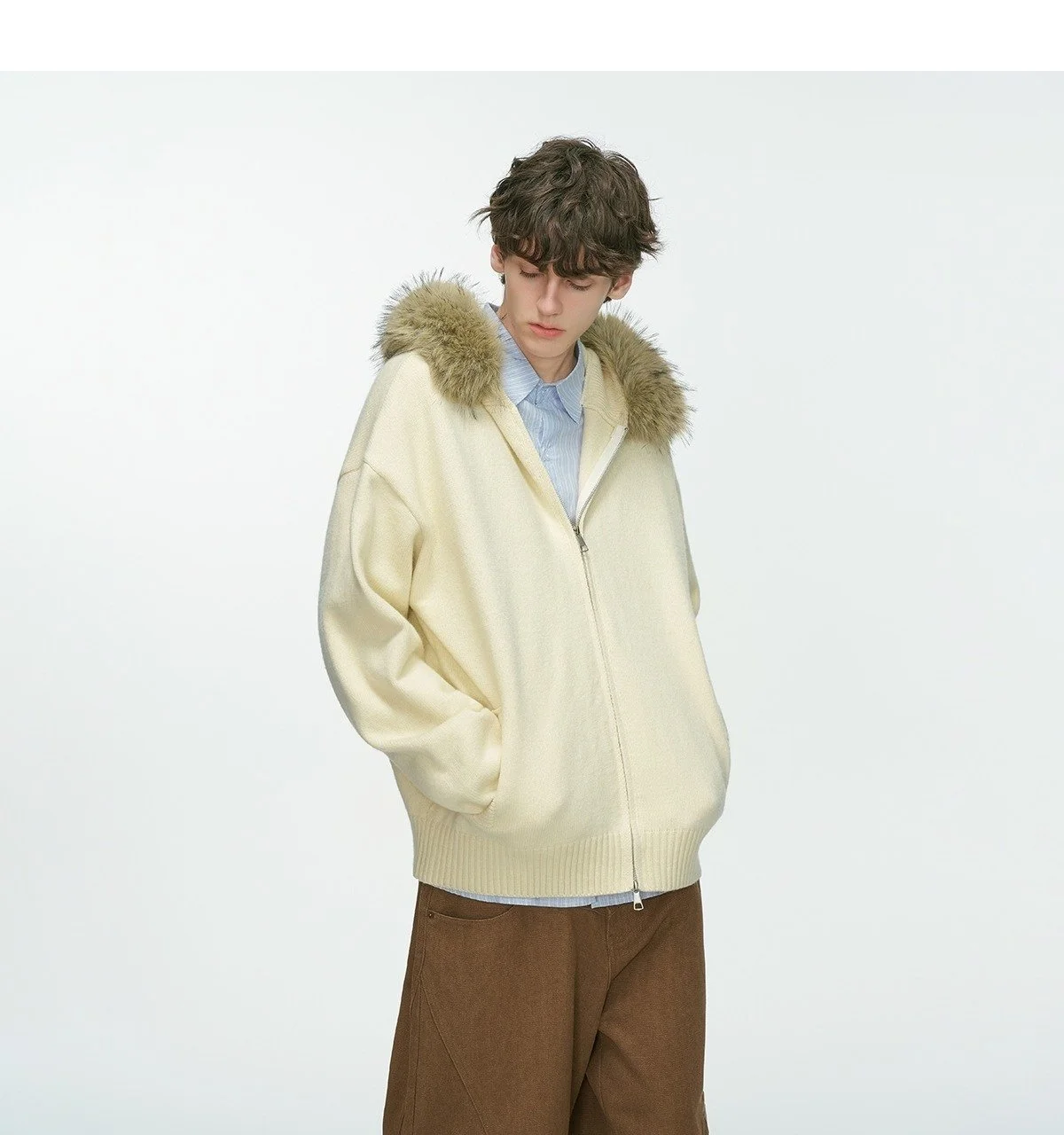 New Men's Winter Thickened Warm Detachable Fur Collar Knitted Open Cardigan